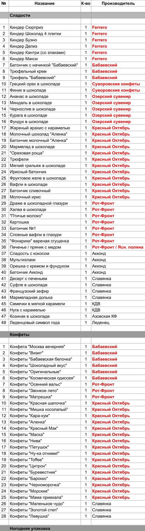 Жареный арахис с карамелью (1 шт), Молочный шоколад "Аленка" (1 шт), Батончик молочный "Аленка" (1 шт), Мармелад в шоколаде (1 шт), "Ореховая роща" (1 шт), Трюфели (1 шт), Мягкий грильяж в шоколаде (1 шт), Ирисный батончик (1 шт), Фруктовое желе в шоколаде (1 шт), Вафли в шоколаде (1 шт),Батончик сливочный (1 шт),  Молочный ирис ( шт), Конфета "Красная шапочка" (1 шт), Конфеты "Мишка косолапый" (1 шт), Конфеты "Кара-Кум" (1 шт), Конфеты "Алёнка" (1 шт), Конфеты "Красный мак" (1 шт), Конфета "Маска" (1 шт), Конфеты "Нива" (1 шт), Конфета "Петушок" (1 шт), Конфеты "Ну-ка отними!" (1 шт), Конфета "Toffee" (1 шт), Конфеты "Цитрон" (1 шт), Конфета "Буревестник" (1 шт), Конфеты "Барокко" (1 шт), Конфета "Черноморочка" (1 шт), Конфеты "Морские" (1 шт), Конфета "Мама приехала" (1 шт)